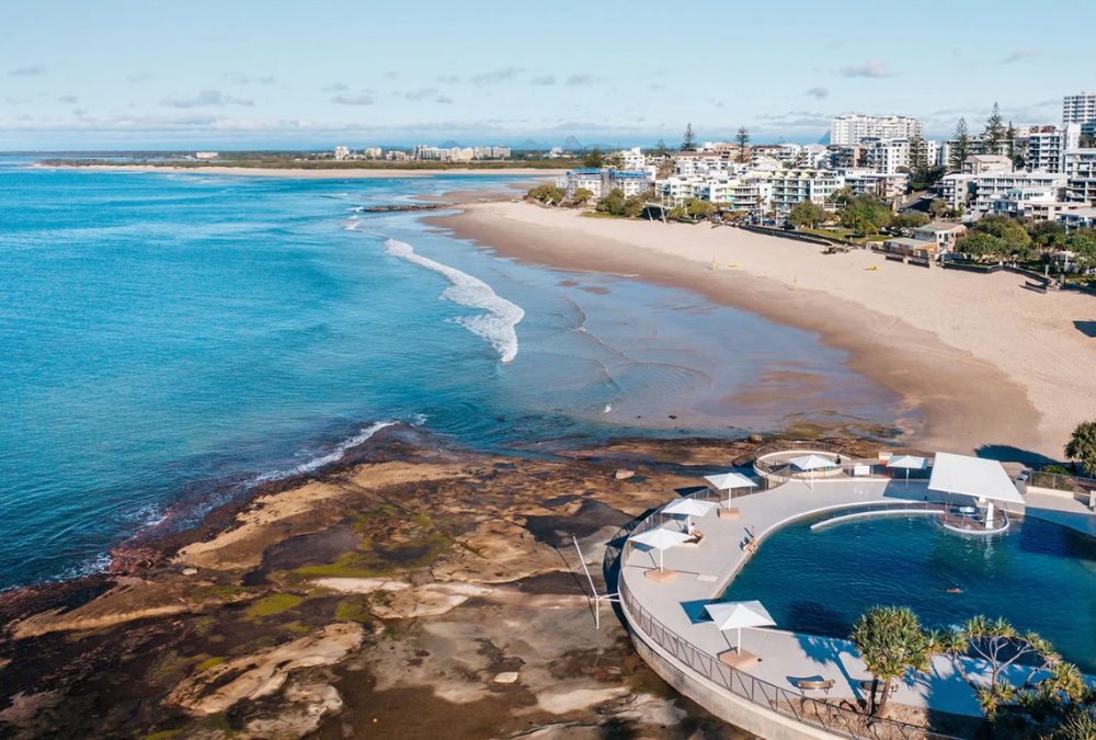 Coolum Beach has a wide sandy shore and a rocky headland. The headland provides excellent ocean and town views. Surfers come for steady waves, and local surf schools teach lessons. The beach has a long boardwalk for walking and cycling.